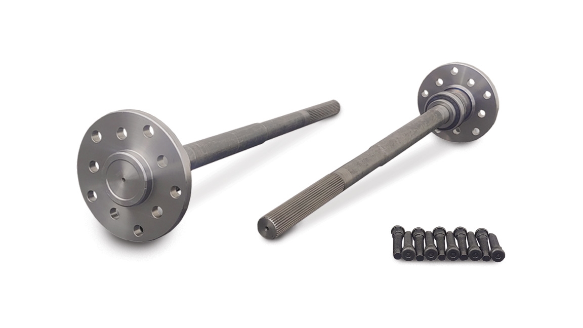 9″ Ford 28 spline forged rear axles with 2.5″ brake offset and a 2.800 drum register. Available in 55″, 56″, and 57″ AF-AF sizes and made specific to suit centered housing rear ends that require 1 axle to be shorter that the other axle. Offering dual Ford patterns with 1/2-20 press in wheel studs included. OEM Ford bearings and retaining collars pre-installed.
