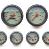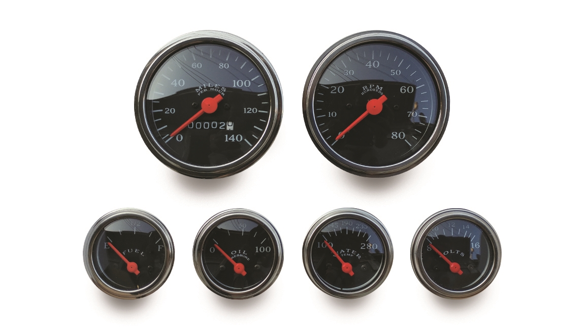Universal application 6 gauge set with all sending units. Includes 140 MPH mechanical drive speedometer, 8,000 RPM Tachometer, and all electric auxiliary guages with sending units, including water, oil, and fuel level. Features scratch resistant curved glass lenses, corrosion resistant polished bezels, and all brass terminals. All guages can be illuminated for excellent night time visibility. All mechanical speedometers have 1 – 5 miles on them new to ensure proper mileage calibration. Speedometer and tachometer size: 3 3/8″. Auxiliary guage size: 2 1/16″. SOLD AS KIT