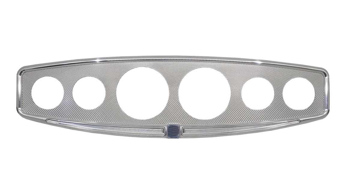 Leading Edge Machine 6 hole hot rod gauge panel. Raw, CNC machined aluminum housing with crosshatched insert. 19 1/2″ wide x 5 3/8″ tall. Accepts standard 3 3/8″ and 2 1/8″ gauges. Made in the USA. SOLD EACH