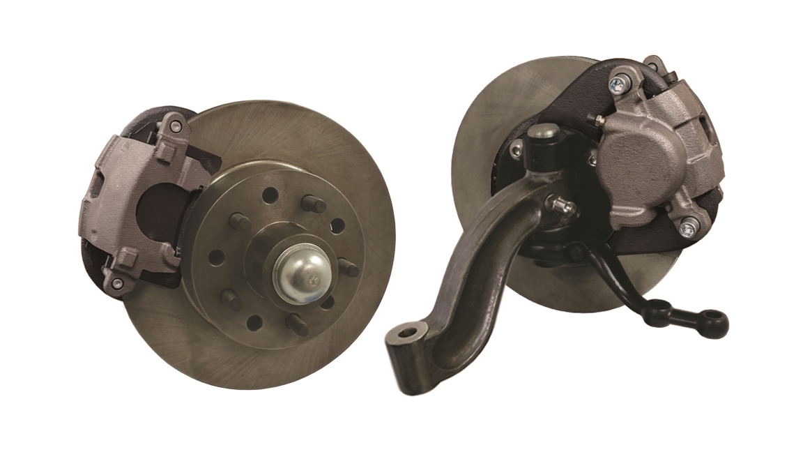 The GM type disc brake kit has always been a big hit in the industry for it’s good stopping power and affordable price. However, there was always a problem of having to install a bearing adapter on the spindle in order to make the kit work… Not any more. Our new kit includes vented 11″ X 0.875″ rotors with 1/2″ wheel studs that do not require any bearing adapters, narrowing track width 1″ over alternative brands. Features replaceable GM metric calipers and plain steel caliper brackets. Accepts 10mm X 1.5 brake line fittings. All bearings, seals, and spindle nuts included. Spindles, steering arms, king pin kit, and brake fittings are NOT included in this kit, they are shown for reference only.